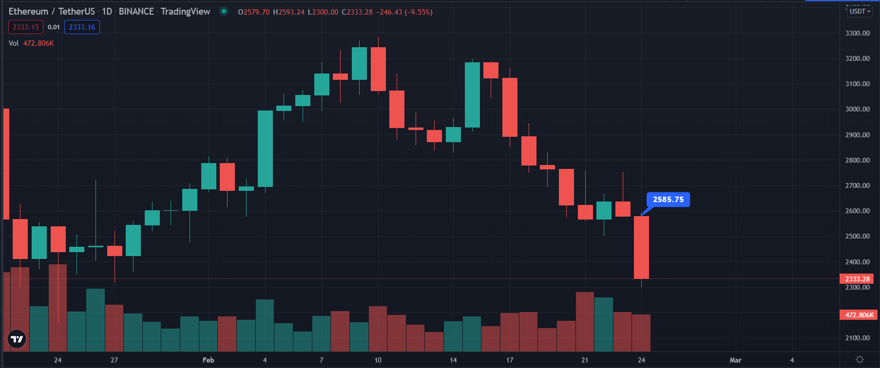 Following the crisis, Ethereum fell 12.07% in the last 24 hours. It also has a current market capitalization of $279.7 billion. Moreover, it has been declining around 24.17% in the past seven days. At the time of writing, it trades at $2,349.02.