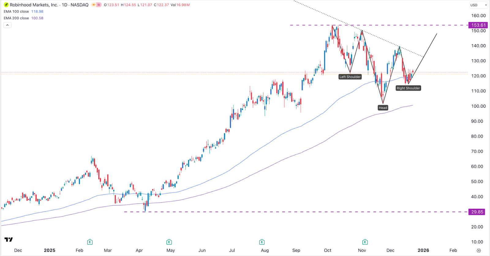 The Robinhood stock depicts great prospects for a recovery. The stock has soared to its present value of $120 after falling to its lowest point of $29.85 in April. Its 100-day and 200-day Exponential Moving Averages (EMAs) have just crossed the stock, indicating a positive movement. A head-and-shoulders chart pattern has been inverted, which is considered to be a positive change of direction indicator. The high of this pattern is at $100, the left shoulder at $120, and the stock is in the process of testing the right shoulder.