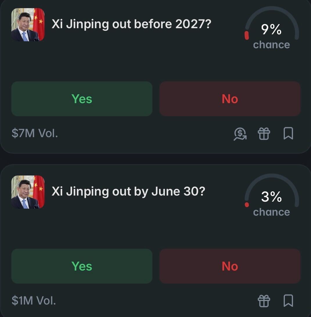 For Xi Jinping the platform hosts markets including “China coup attempt before 2027?” and “Xi Jinping out before 2027?”