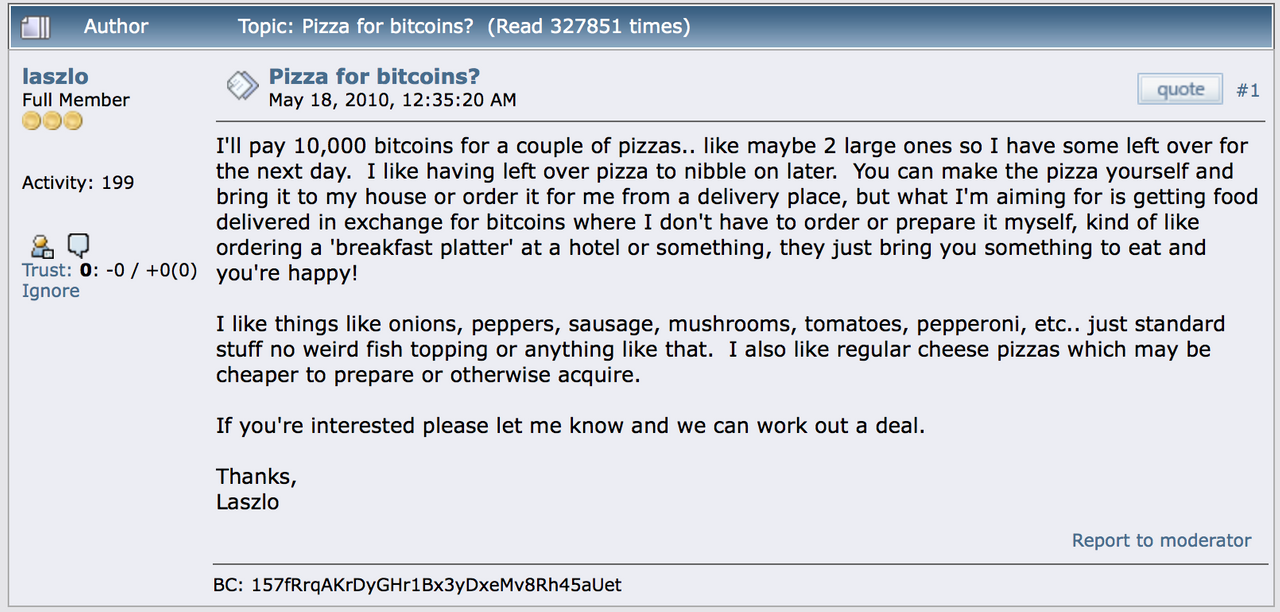 Ten years ago yesterday, programmer Laszlo Hanyecz paid 10,000 Bitcoin for two Papa John’s pizzas in a trade that took place publicly on the Bitcoin Talk forum.
