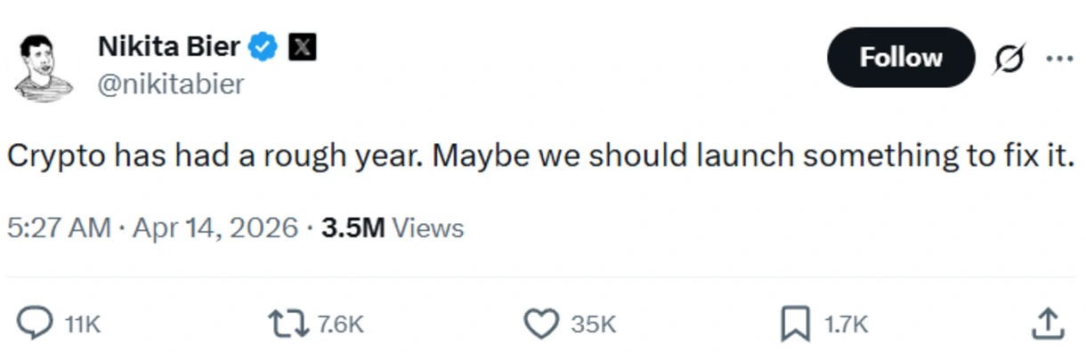 A single line from X’s head of product is enough to get crypto speculating again. Nikita Bier wrote, “Crypto has had a rough year. Maybe we should launch something to fix it,” hinting at a possible idea or product without offering any details. The post comes as markets struggle with macro pressure, declining prices, and fading momentum across major assets.