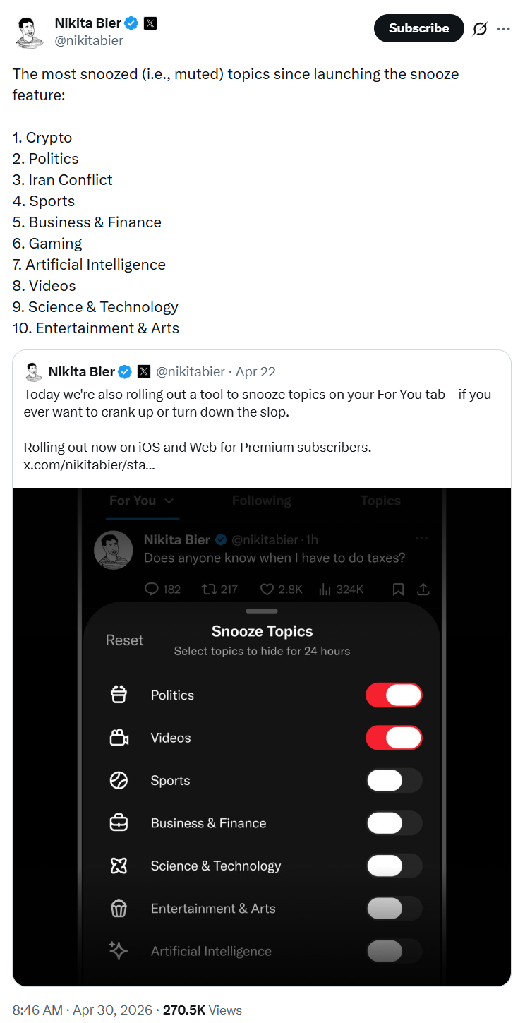 The snooze feature, which lets Premium subscribers hide topics from their For You feed for 24 hours, was launched on April 22. At the time, Bier described the tool as a way for users to “crank up or turn down the slop,” apparently a nod to the flood of low-quality content that has increasingly plagued the platform.