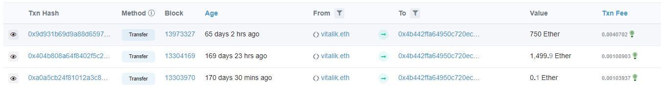 Today, we can exclusively reveal (through publically accessible blockchain ledgers, of course!) that Vitalik’s go-to test amount is 0.1 ETH. It seems the first time he interacts with any new address, it is standard practice. After that, as the image below shows, he is happy to send millions of dollars worth of crypto without a test transaction. So perhaps the man is no mortal after all.