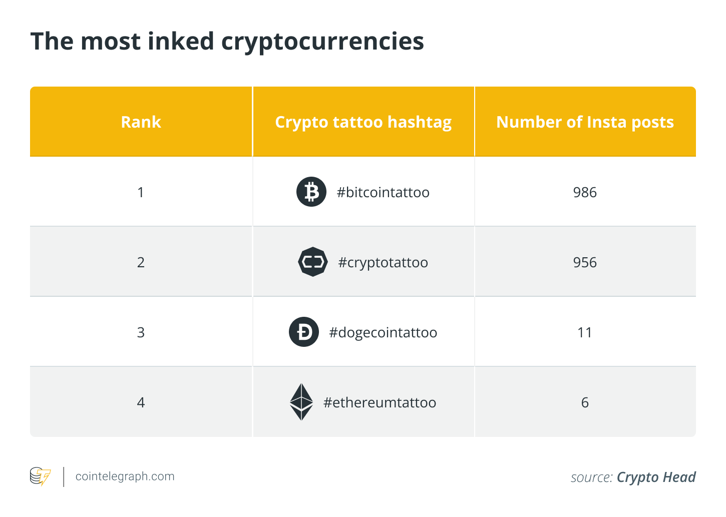 According to the latest data from Crypto Head, more than 900 people worldwide have inked themselves with the Bitcoin (BTC) “B”, while Dogecoin (DOGE) tattoos and Ethereum (ETH) tattoos are on the rise.