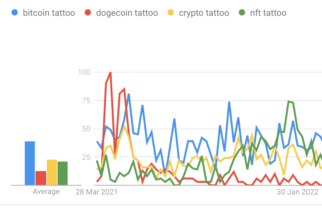 While Dogecoin is deep outside the top five cryptocurrencies, it remains the second most popular cryptocurrency tattoo search with 700 average monthly searches. However, the Dogecoin hype of 2021 is clearly on the wane.