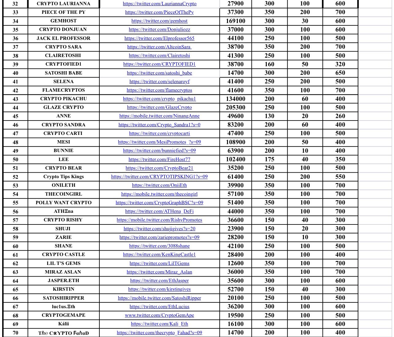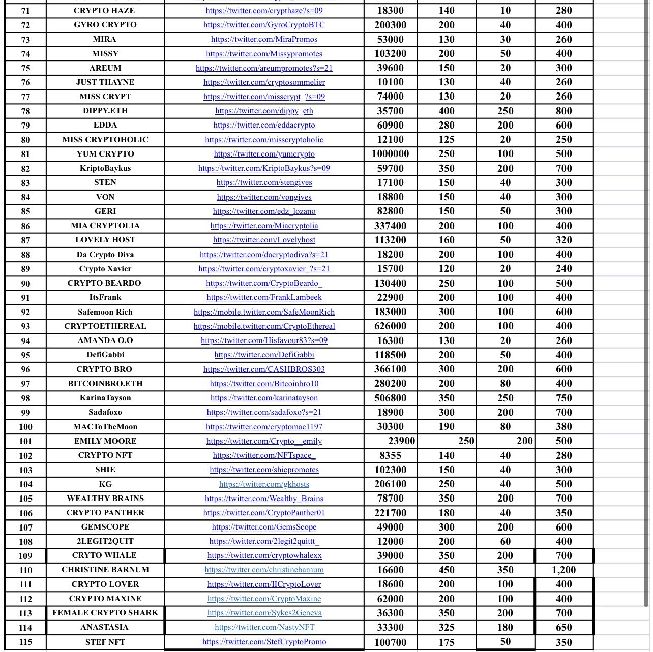 The leaked list, which can be found below, tabulates 115 Crypto influencers on Twitter and how much it costs to have each shill a project. Additionally, the leaked list seems to be from a crypto project with a budget of $120,000: $80k for a shill tweet and $40k for a retweet.