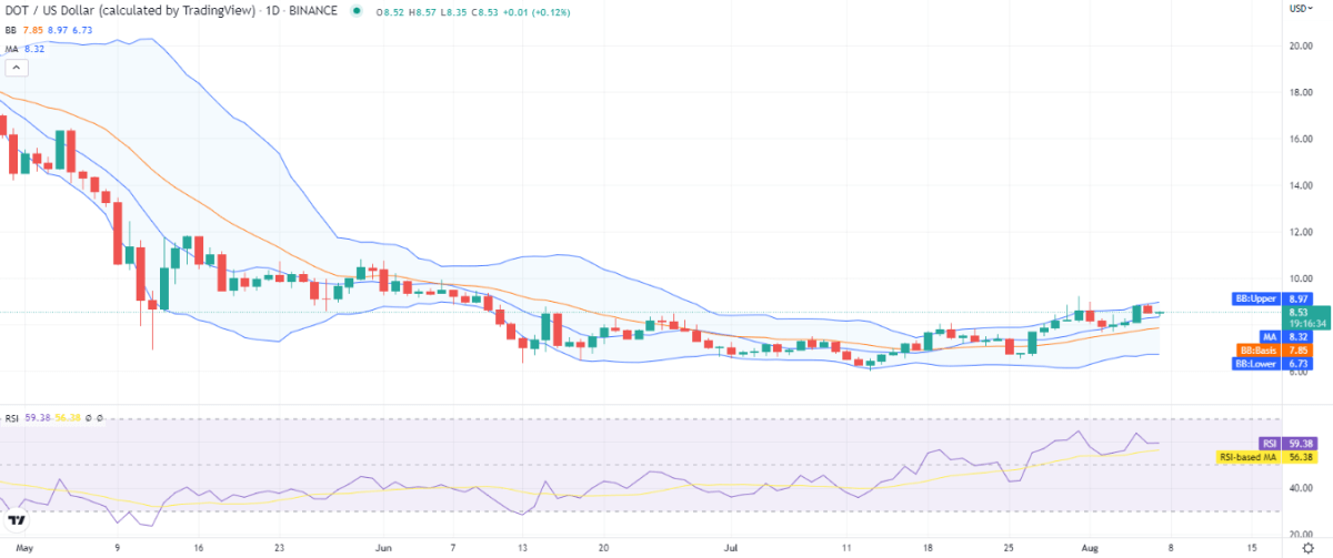 DOT/USD 1-day price chart. Source: TradingViewThe volatility is on the increasing side, and now the upper band is present at $8.97, representing the strongest resistance, and the lower band is present at the $6.73 mark, making an average at the $7.85 mark, below the price level, the lower band is representing the strongest support for DOT.