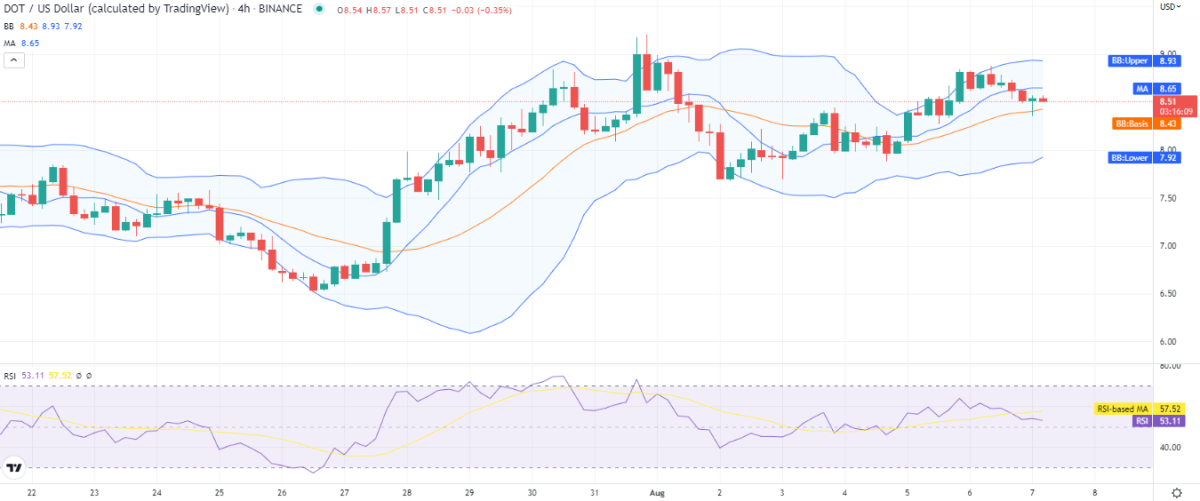 DOT/USD 4-hours price chart. Source: TradingViewThe price is trading towards the mean average of the Bollinger Bands on the 4-hour chart, which is present at $8.4, just below the price level. The upper band is present at the $8.93 mark, whereas the lower band is present at the $7.92 mark. The price came below the moving average (MA) a few hours back which is present at $8.65. The RSI has reached index 53 and shows a downwards curve, as bears have taken over the market.