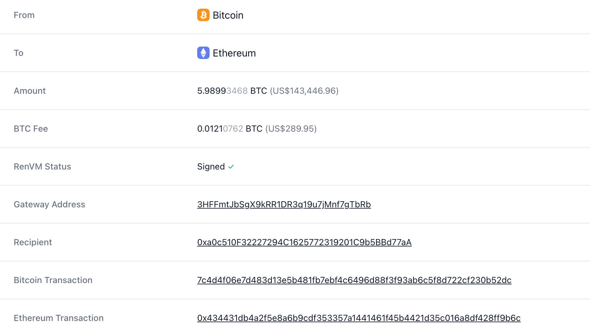As confirmed by renMAX, all Ren transactions are fully transparent and visible through the Ren Explorer. The below image illustrates a transaction allowing Bitcoin to be moved to the Ethereum blockchain through the bridge. The recipient and sender’s addresses are visible, making it of little use to money launderers.