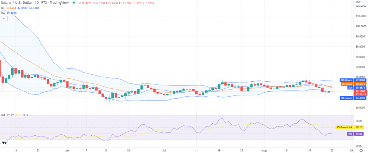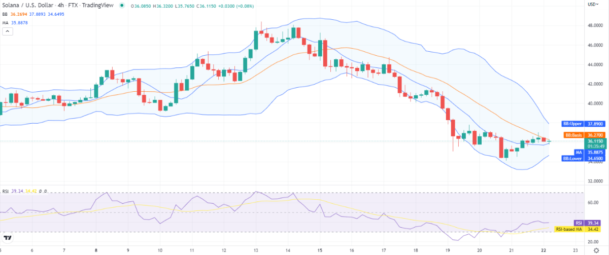 The one-day Solana price analysis confirms that the price is on the decreasing side for today. Chances of recovery have been postponed as of now, and the bears are dominating the price charts as more selling activity is taking place. The price has decreased to $36.1, and overall the cryptocurrency lost around 19.35 percent value during the past week. The moving average (MA) value is trading at $39.4 after crossing below the SMA 50 curve.