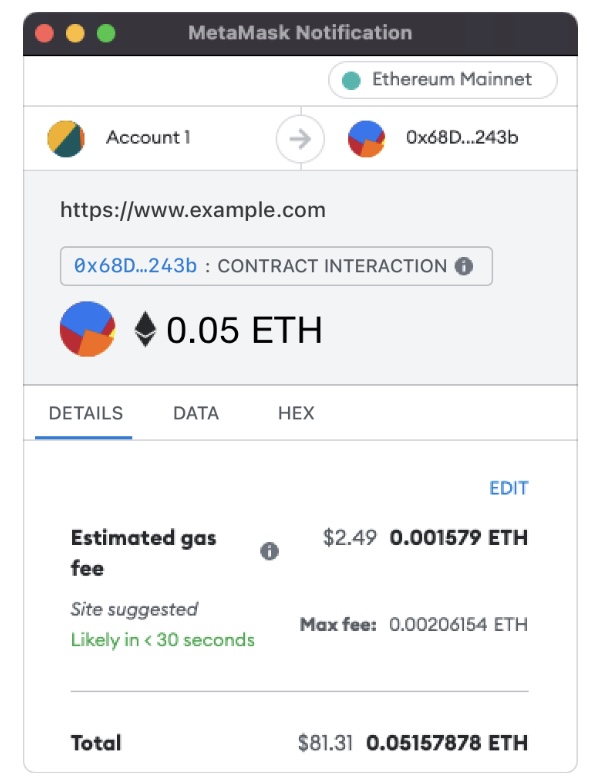 We see the address of the smart contract we’re interacting with, the website that initiated the transaction, and then a lot of details about the funds we’re sending to the contract. However, there’s no indication of what this contract call does or any indicator that it’s safe to interact with.