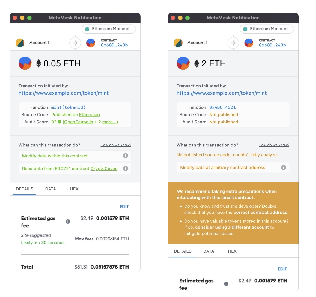 As a visual example, here are two quick user experience (UX) design mock-ups of MetaMask transactions — one that’s likely to be safe, and one that’s less certain.