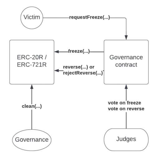 In the hypothetical event of a reverse request, the victim of the hack or theft would first request a freeze to the governance contract on the stolen funds. A decentralized quorum of judges would then vote to freeze the assets or not. If accepted the freeze would be initiated and evidence must be supplied to the judges in a ‘trial’ to initiate the reversal.