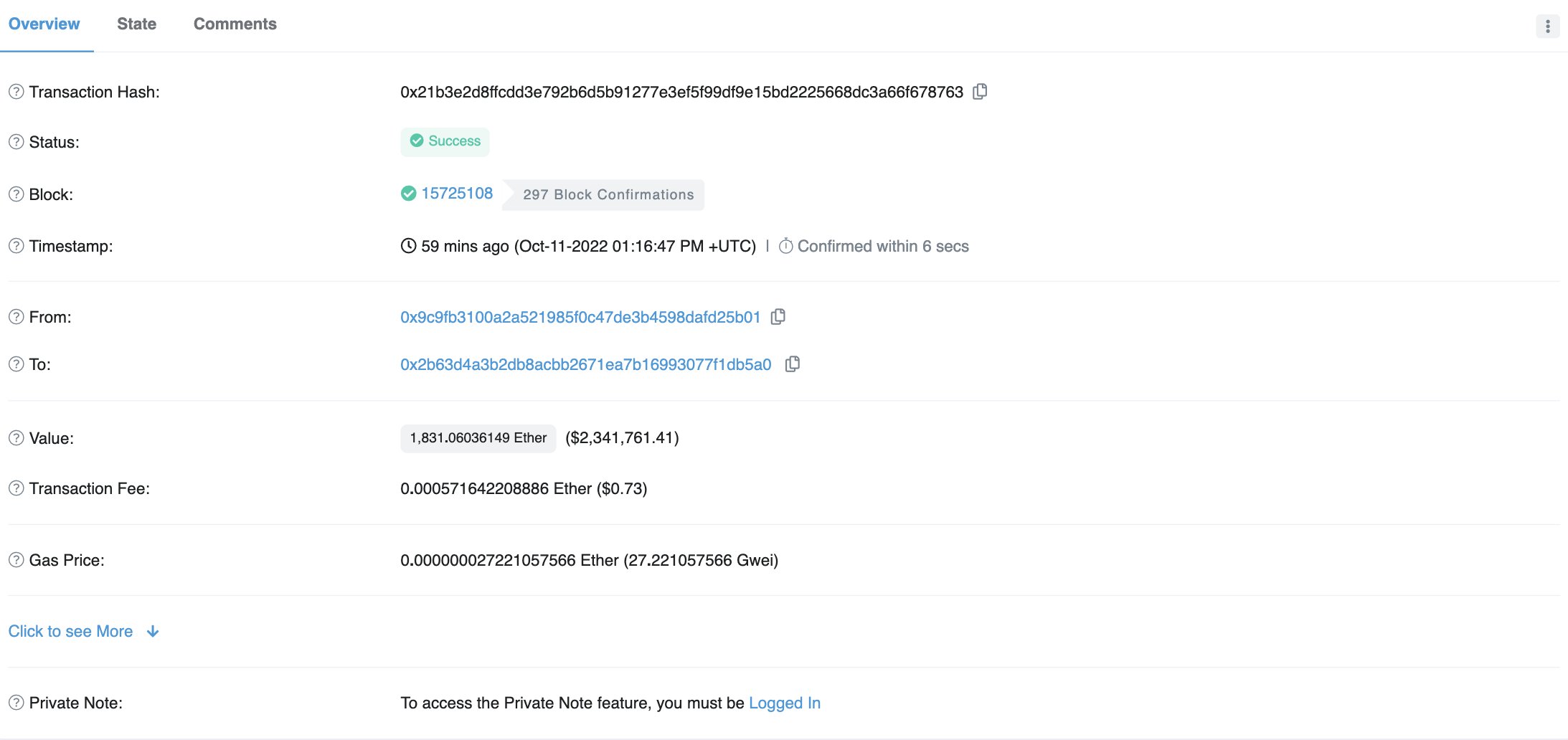 “Seems like TempleDAO got exploited. The exploiter funded from SimpleSwap and already transferred 1,831 ETH (~$2.34M) to a new address 0x2B63d…B5A0.”
