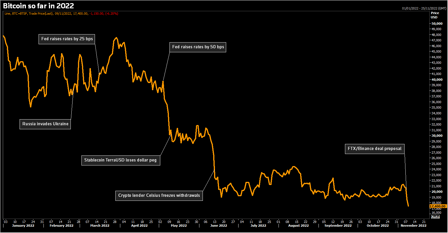 BTC has lost around 63% of its value since the beginning of the year. The price of Bitcoin dropped below $16,000 by Wednesday evening after falling below $18,500 late Tuesday, sending it down to levels not seen since November 2020, when BTC hit an all-time high of $69,400 amid the bull market.