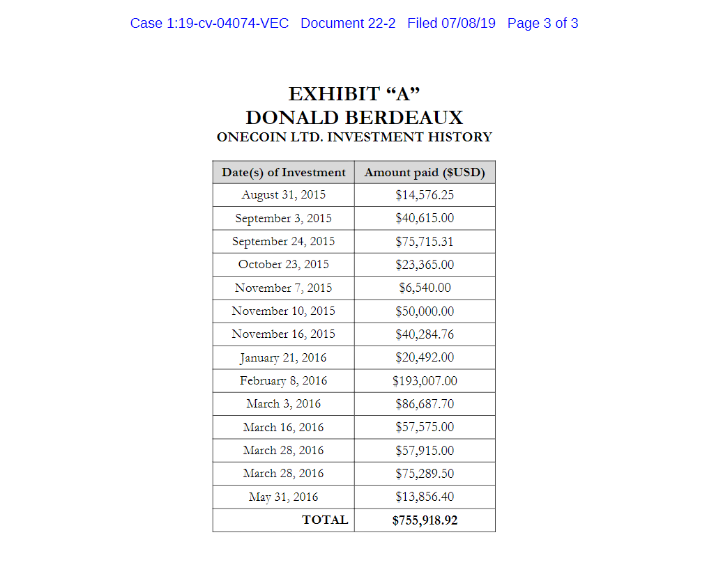 According to documents submitted in a Manhattan court on July 8, proposed lead plaintiff Donald Berdeaux invested around $755,918.92 in OneCoin between August 2015 and May 2016. Between August and November 2015, Berdeux invested $252,096.32 into OneCoin. The next year he added $504,822.60.
