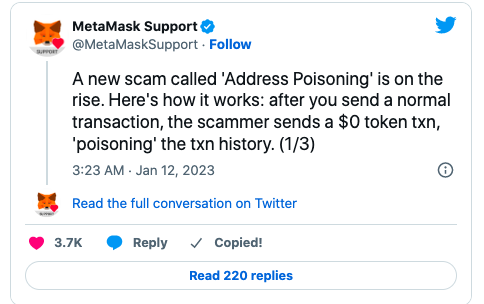 The digital wallet provider MetaMask warned users of an "address poisoning scam." Attackers poison users' transaction histories by sending tokens worth zero dollars to their wallets. Scammers will use wallet addresses generated by vanity address generators that match the first and last characters of their victims' wallet addresses. As a result, unsuspecting users send their funds to the wrong copycat address.