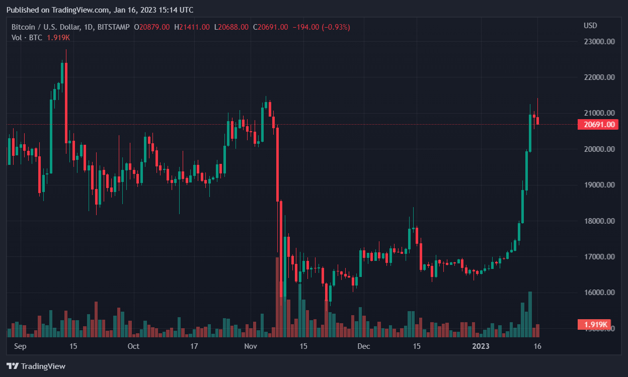 At the time of writing, Bitcoin is trading around $20,800, up 21% in the last week. It is currently trading above its 50-day Simple Moving Average (SMA), which indicates that the price will remain bullish in the short term.