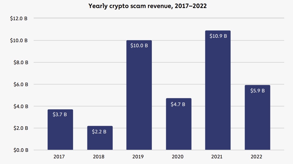 Crypto scam revenue fell significantly in 2022, from $10.9 billion the year prior to just $5.9 billion.