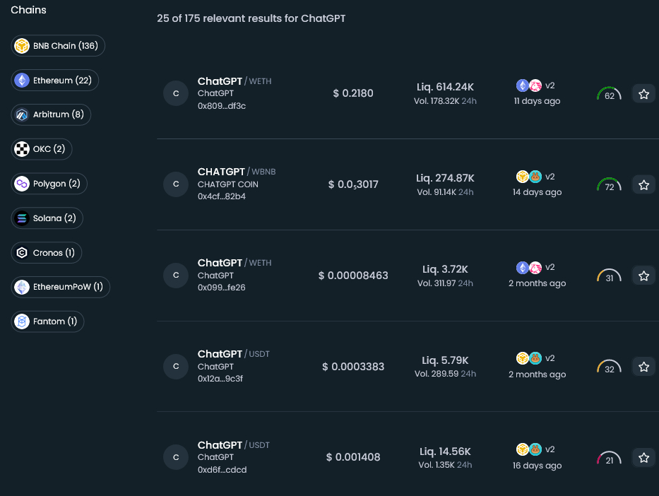 And that's not all. There are a whopping 175 coins called 'ChatGPT', as shown by the website. The vast majority, or 136 of these, have been issued on BNB Chain, 22 on Ethereum, 8 on Arbitrum, and the rest on OKC, Polygon, Solana, Cronos, EthereumPoW, and Fantom. These have hundreds of thousands of dollars in Liquidity.