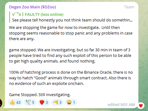 Reports from the Degen Zoo Telegram group indicate that the team agreed to briefly stop and launch an investigation into possible manipulation.