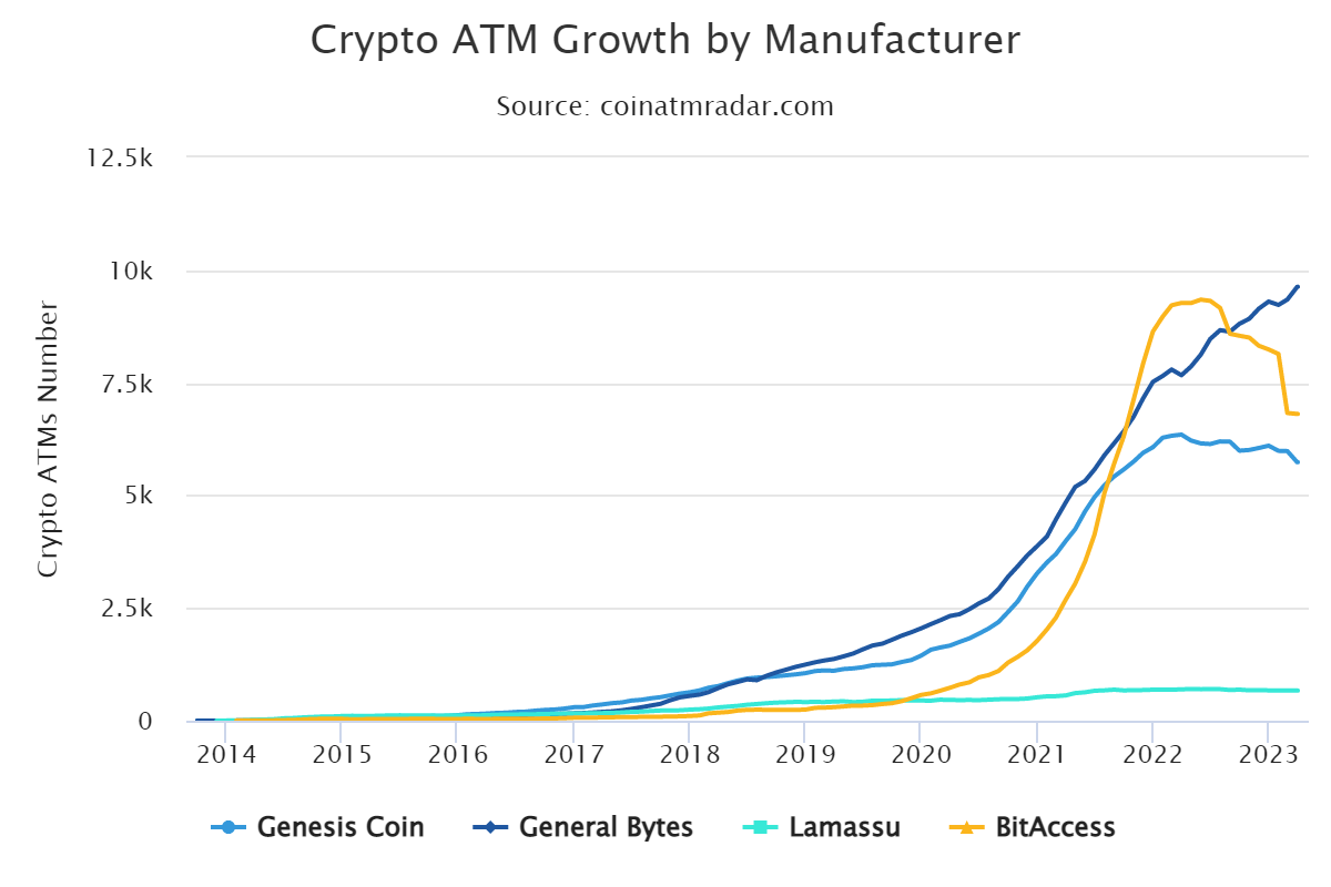 As of April 03, there are over 33,743 active crypto ATMs globally. General Bytes is a leading crypto ATM manufacturer, followed by BitAccess, Genesis Coin and CoinCloud.