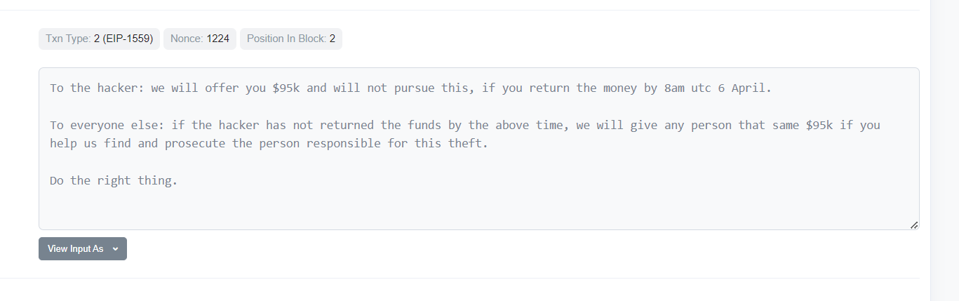 In an on-chain transaction on the Arbitrum blockchain, Sentiment sent a message to the hacker offering $95,000 if the hacker returned the funds by April 6, urging the hacker to do the right thing. If the hacker did not return the funds, the protocol also offered the money to anyone who could help find and prosecute the culprit.