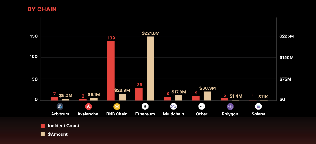 Out of the stolen funds within the quarter, over $31 million were lost to 90 exit scam incidents while more than $222 million were lost in 52 flash loan and oracle manipulation exploits. In terms of incidents and the amount lost per blockchain, CertiK highlighted that BNB Chain had 139 incidents, which is the most number of incidents in the quarter. Meanwhile, despite having fewer incidents, Ethereum had $221 million in losses, the most amount lost in the first quarter of 2023.