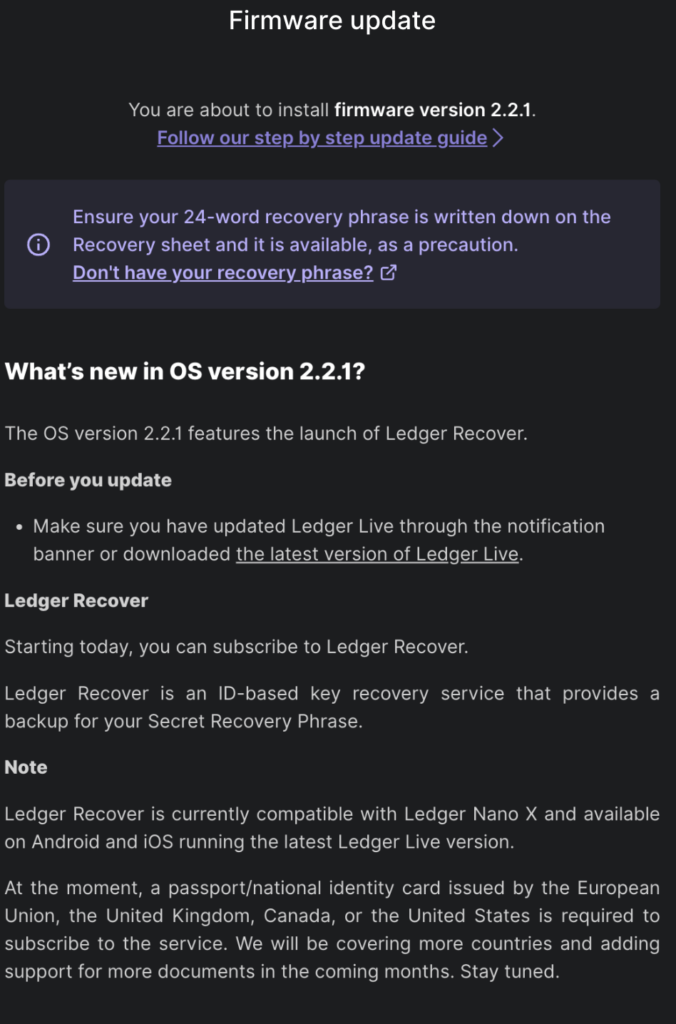 This ID-based subscription service allows users to retrieve their secret recovery phrase and is set to be included in the upcoming firmware release 2.2.1 for Ledger Nano X hardware wallets.