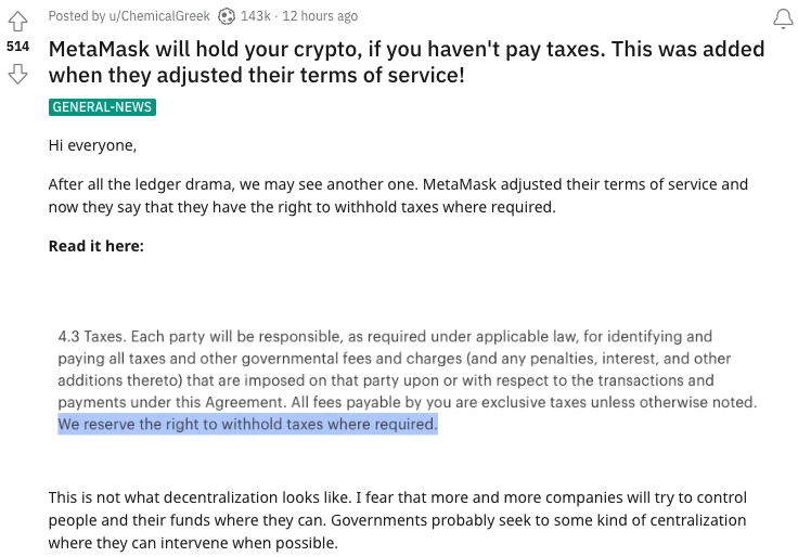 Certain members of the crypto community cried foul play on May 21 after users noticed a section of MetaMask's terms of service that stated the company reserved the right to withhold taxes where required,” with some believing this related to a users’ income taxes.