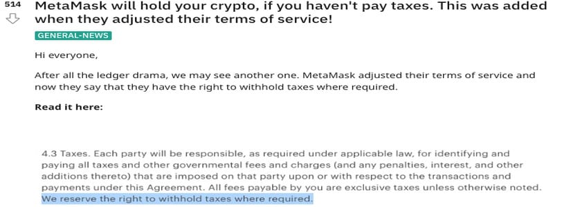 The thread regarding the possibility of MetaMask holding taxes for crypto first popped up on Reddit in the r/cryptocurrencies sub. Not too long after its publication, the post gained more than 500 upvotes, coupled with approximately 600 comments. As a result, many within the crypto community claimed that MetaMask has followed in footsteps similar to those of Ledger, which recently startled users with a controversial upgrade.