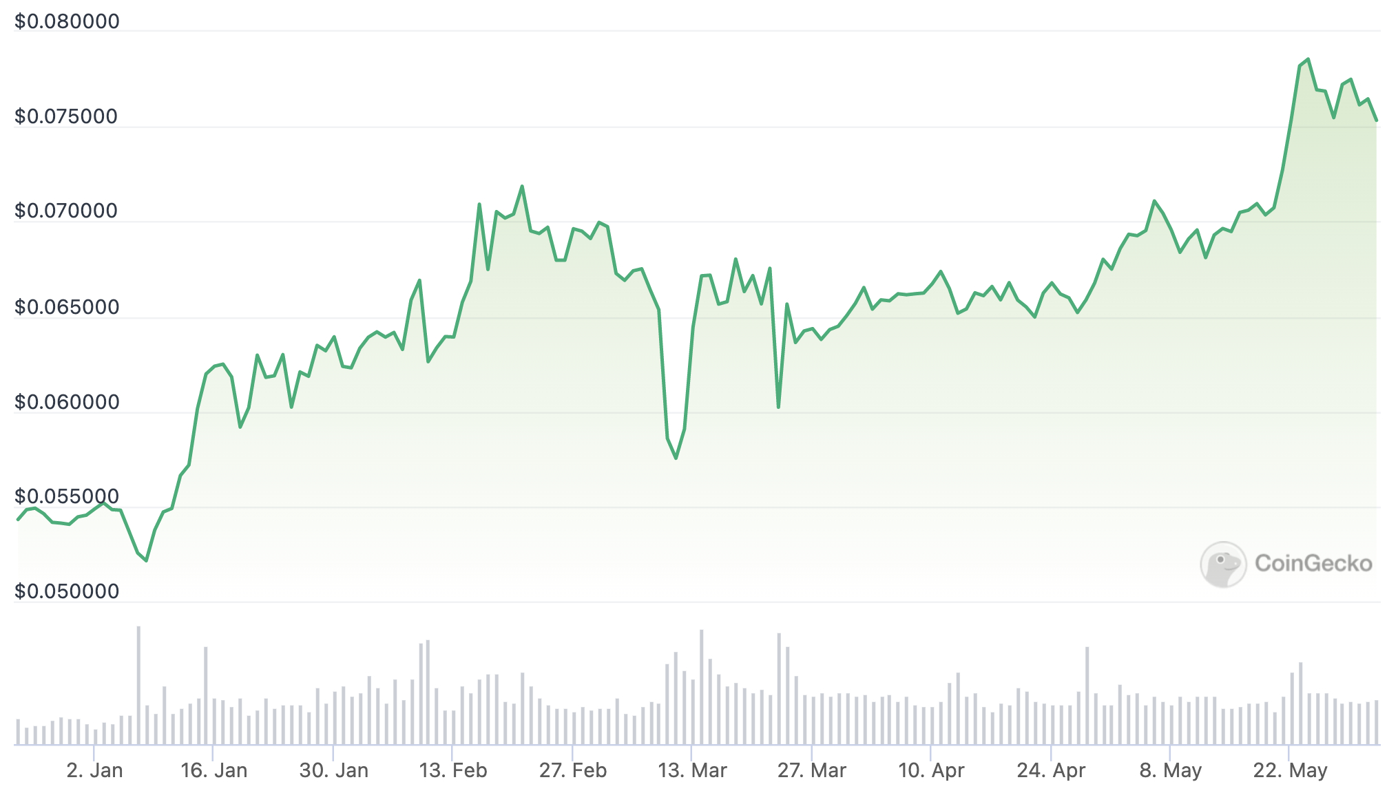 From a price of $0.055 on January 1, TRX on Thursday traded at $0.075, an increase of around 37%.