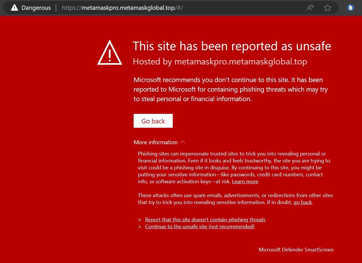 According to the MetaMask security team, the incredible growth potential of Web3 makes the ecosystem attractive to scammers and thieves. When a user clicks on any of the fake links embedded within the URLs of government websites, they are redirected to a fake URL instead of the original MetaMask site. Once access is gained, Microsoft Defender, Microsoft’s security firewall, warns users of a possible phishing attempt.