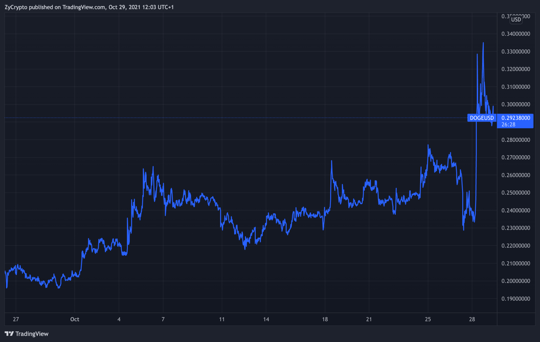 An army of Doge faithfuls rallied around the meme coin shooting up its price to a two-month ATH of $0.33 with a sustained hover around the price mark over the last 7 hours.