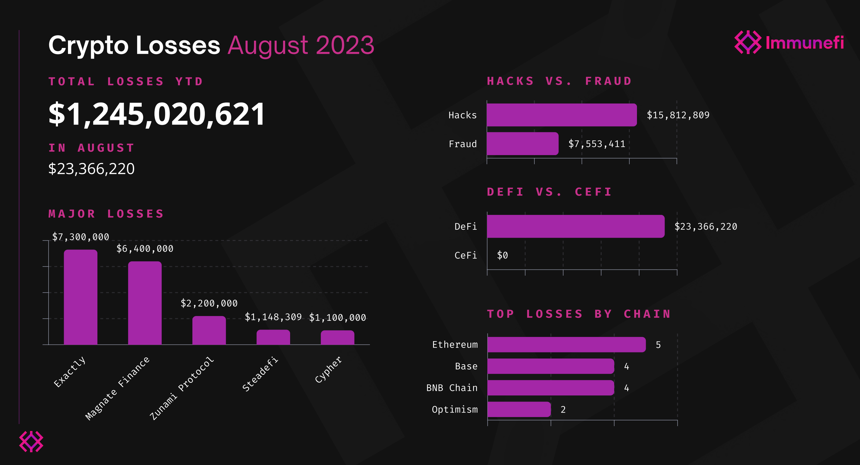 In August, hacks were responsible for a staggering $15.8 million in losses, constituting a substantial 67.7% of the total monthly sum. Fraud accounted for $7.6 million, making up the remaining 32.3%.