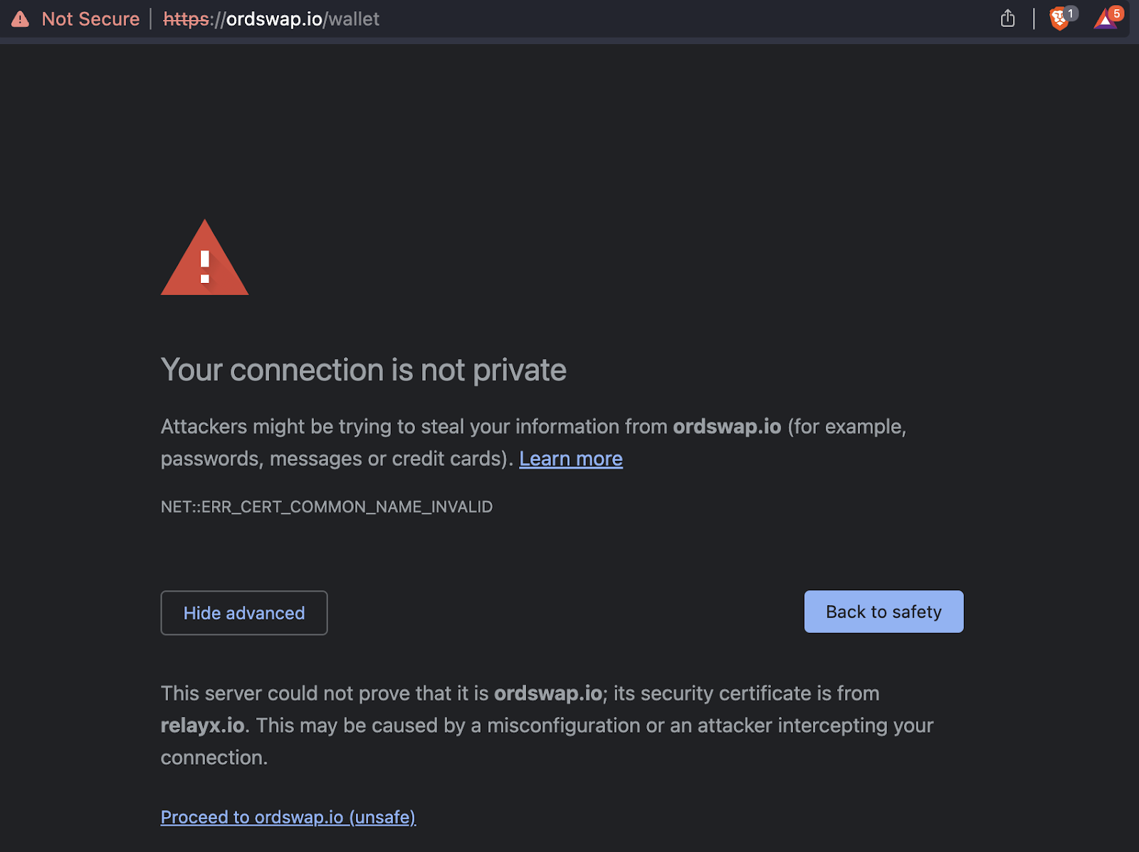“This server could not prove that it is ordswap.io; its security certificate is from relayx.io. This may be caused by a misconfiguration or an attacker intercepting your connection.”