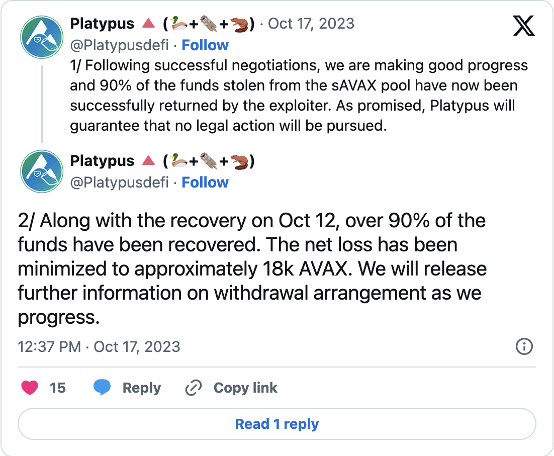 According to an announcement made by the Platypus Finance team on October 17, the protocol’s net loss was limited to 18,000 AVAX, which is worth $167,400. The team also revealed that the hackers voluntarily returned the funds and stated that no legal action would be taken regarding the matter.