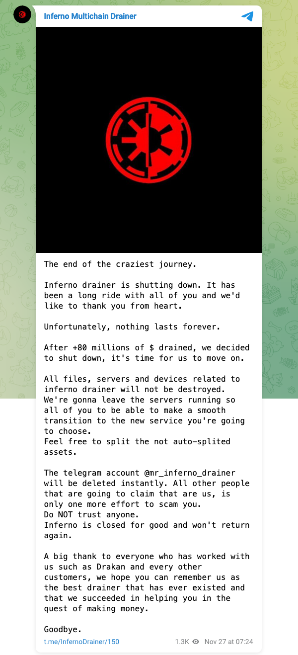 In a Nov. 26 Telegram post, the team behind Inferno Drainer said it was “time for us to move on.” However, it said that the files and infrastructure needed to run the wallet drainer won’t be destroyed but instead will remain active so users can make a “smooth transition” to other services.