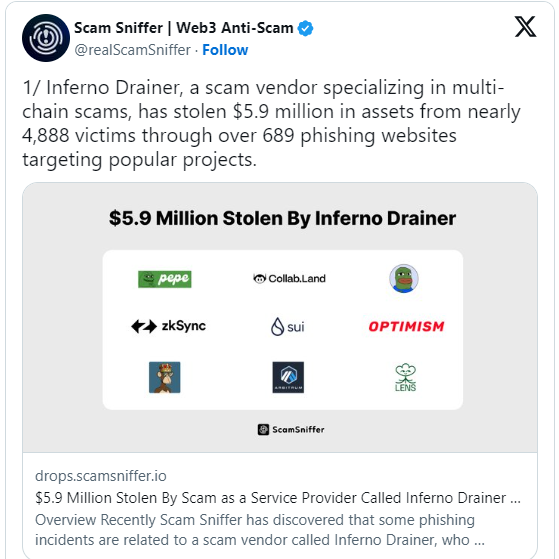 At the beginning of last spring, Inferno, which offered a service to help hackers steal money from other wallets for a 20% cut, was first discussed in the Scam Sniffer telegram.