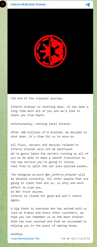 Inferno Drainer announces shutdown after draining over $70M from ~103K victims. pic.twitter.com/8DwtckleiZ