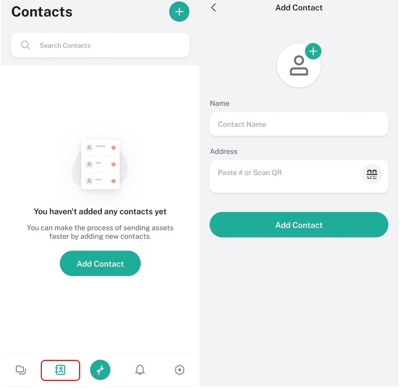 To add a contact, you have to click on the below-highlighted icon. It will open up a window to enter the recipient’s name and their wallet addresses. Just like in the screenshot below: