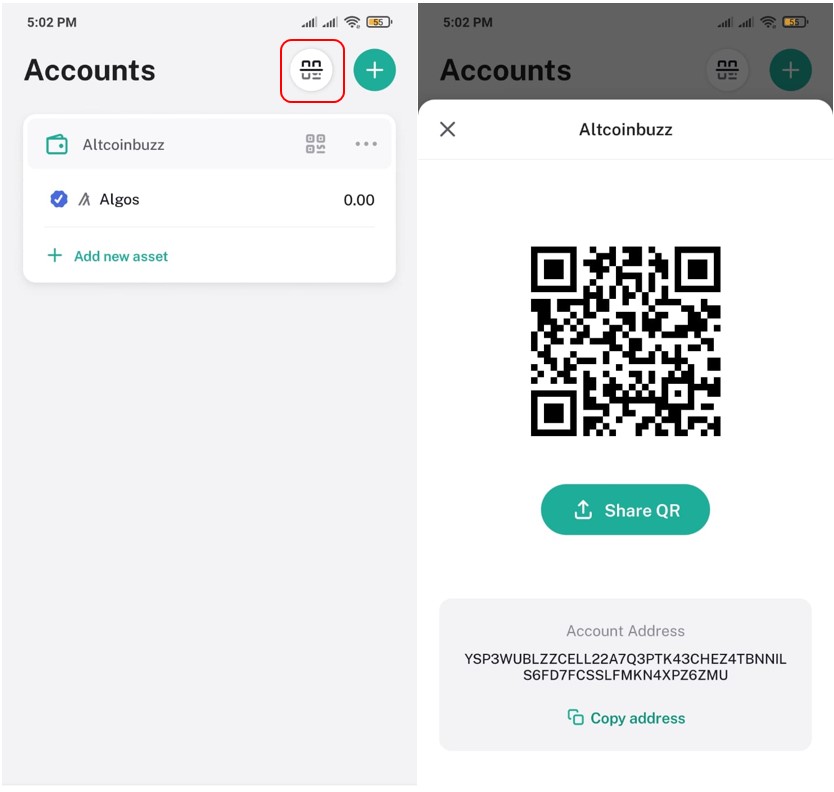 To get the public address, click on the below-highlighted icon, and you will get your receiving address and the QR code that you can copy and share with others.
