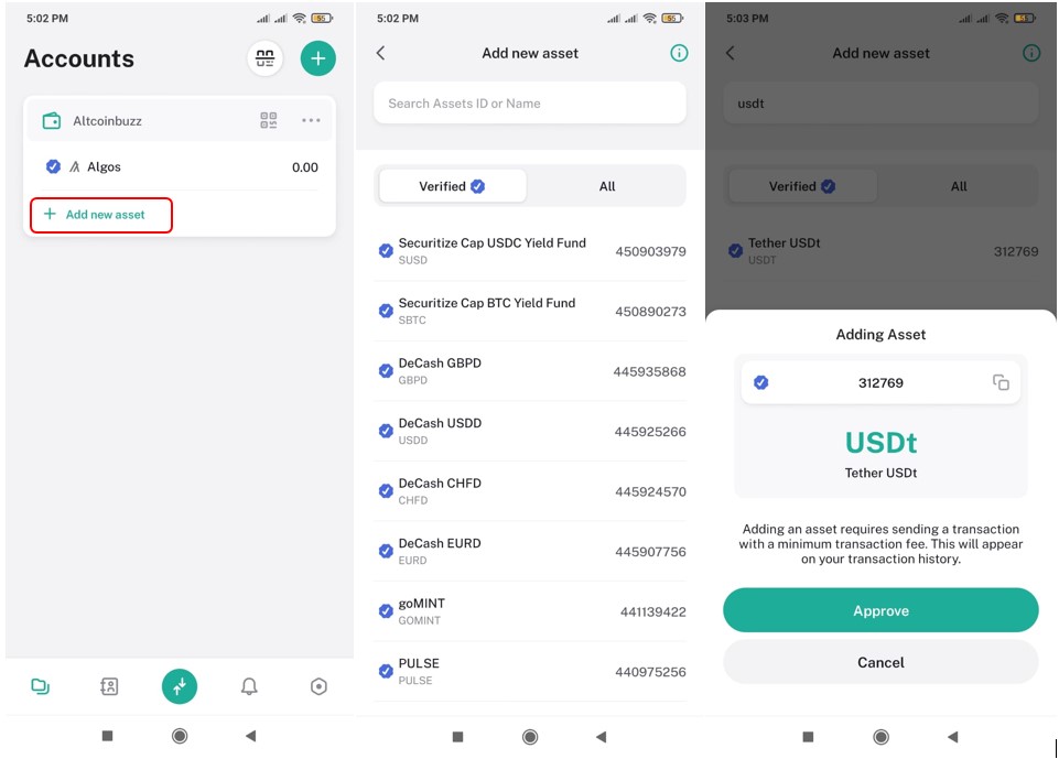You can only add an $ALGO token to your wallet by default. To add any Algorand Standard Assets (ASAs), you must click on the “Add new asset” option. A window will open where you can search and select your desired token.
