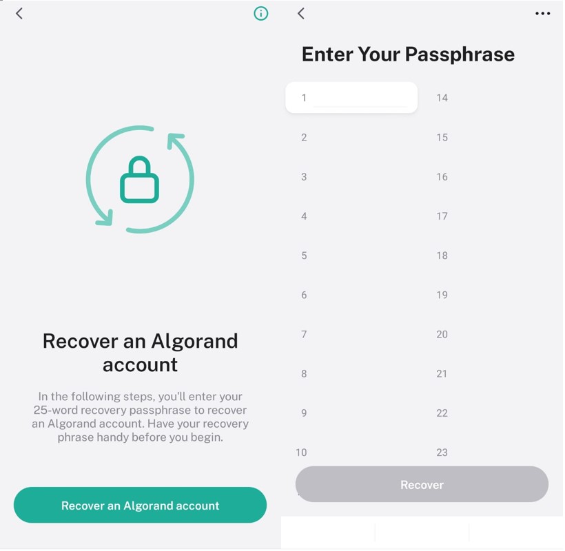 To import a wallet, click on “Recover an Algorand account.” The application will ask you to provide the 25-word backup phrase. Therefore, you have to enter your backup phrase correctly, and your account will be imported.