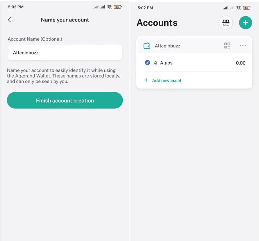 The wallet application will show you the backup phrase. Store it safely. Next, it will ask you to verify your backup phrase, and once it is done, a new blank Algorand account will be created for you.
