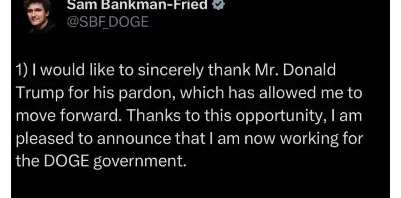 The account @SBF_DOGE, impersonating the founder of the fallen crypto exchange FTX, spread false information, claiming that SBF had been pardoned by former President Trump and had joined the DOGE team. The account also announced the creation of meme coins and provided a contract address related to the coins.