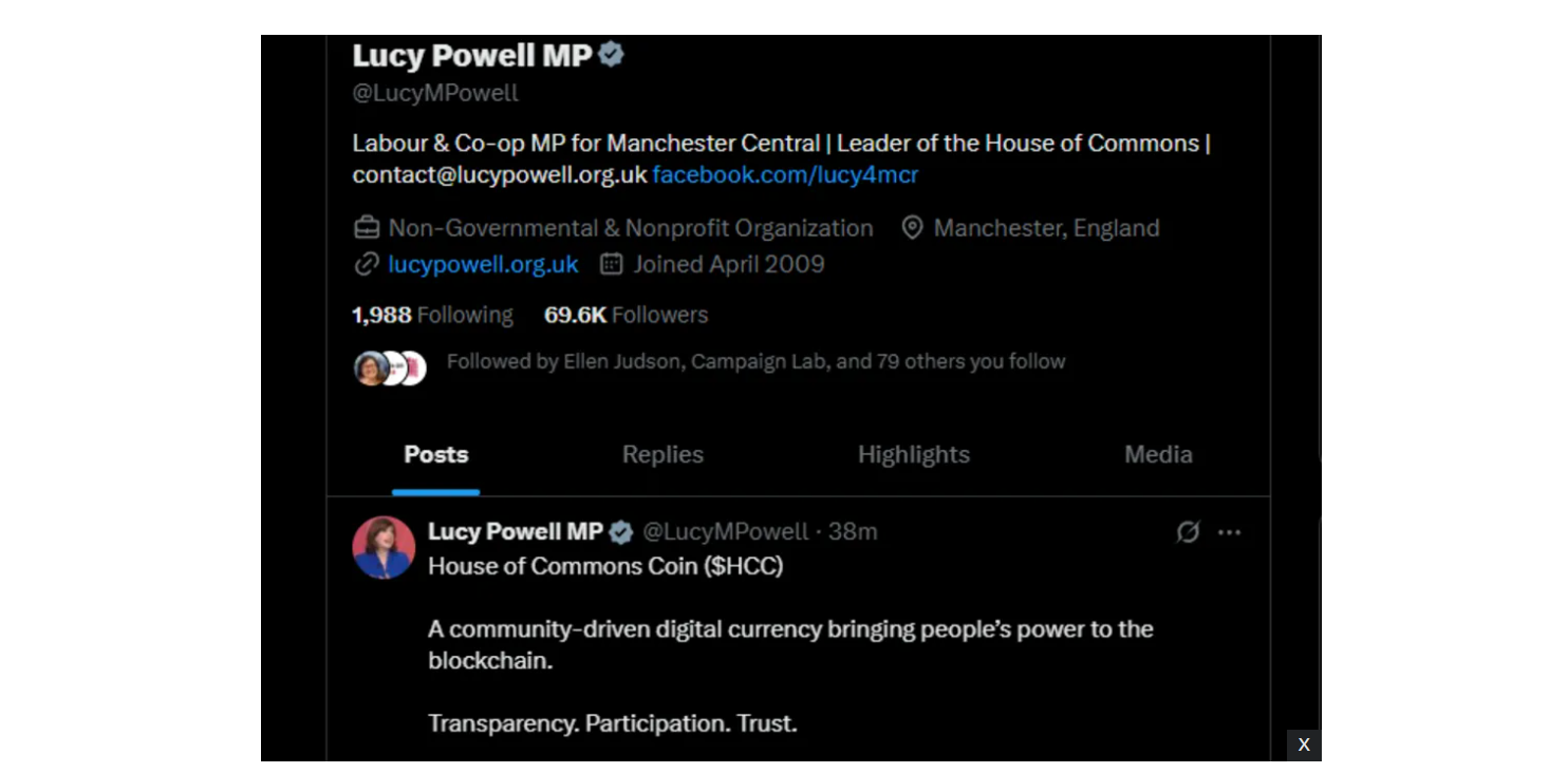 So…someone hacked Lucy Powell—an actual UK government minister—and used her verified X account to shill a totally fake cryptocurrency called “HCC.” Yep, as in House of Commons Coin.
