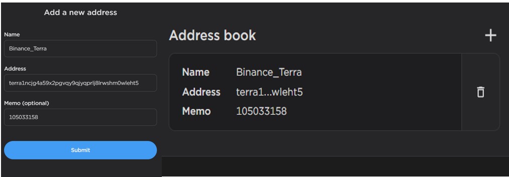 To transfer your tokens, just click on the Withdraw button against the LUNA token and enter the public address (we will explain this in the wallet address section) of your Terra Station wallet. Repeat the same process to transfer UST tokens.