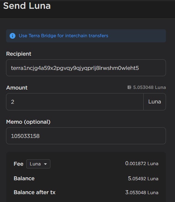 To send, you need to enter the recipient address, the amount you wish to transfer, and memo (if any). Users can select the token (LUNA, UST) that they wish to spend for paying the network fee.