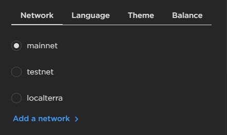 - Network – The wallet application allows the users to connect with the Terra mainnet, testnet, or any custom network through the interface.